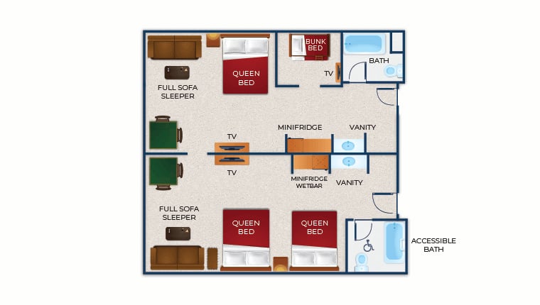 Kids and parents alike love staying in the Deluxe Wolf Den Suite on vacation at Great Wolf Lodge. Where else can you find a suite with a wolf's den built in that doubles as sleeping quarters - even better, it has bunk beds! While they enjoy their space, you'll have yours too, with a private room with two queen beds as well as a queen bed in the main portion of the suite. This suite features two bathrooms each including a bathtub and shower. Note: Bunk beds can accommodate guests up to 5.5'ft.