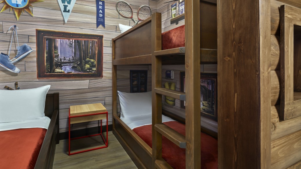 Take family vacation fun to a whole new level when your suite becomes a part of your adventure. The Deluxe Kid Cabin Suite features an in-suite Wiley's Clubhouse, doubling as the kids sleeping space with bunk beds and a day bed. The suite also has a private bedroom with two queen beds and a full-size sofa sleeper. There are an additional queen bed and a full-size sleeper sofa in the main living area. This suite features two bathrooms each including a bathtub and shower. After a day of water park play, everyone will sleep well in this popular retreat.
