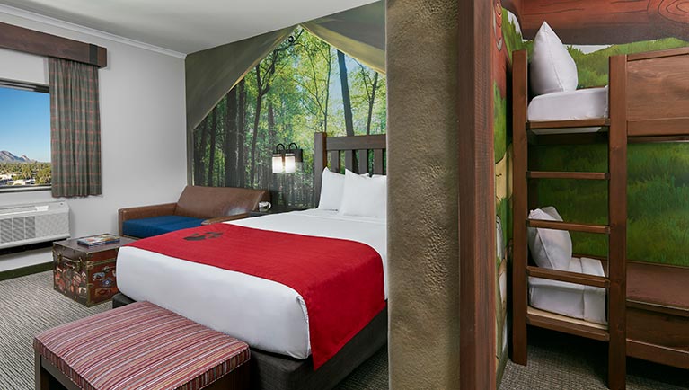 Kids and parents alike love staying in the Wolf Den Suite. The suite includes built-in wolf’s den-themed sleeping quarters. This Northwoods-themed sleeping area is furnished with bunk beds. The main living area features a queen bed and a full-size sleeper sofa.