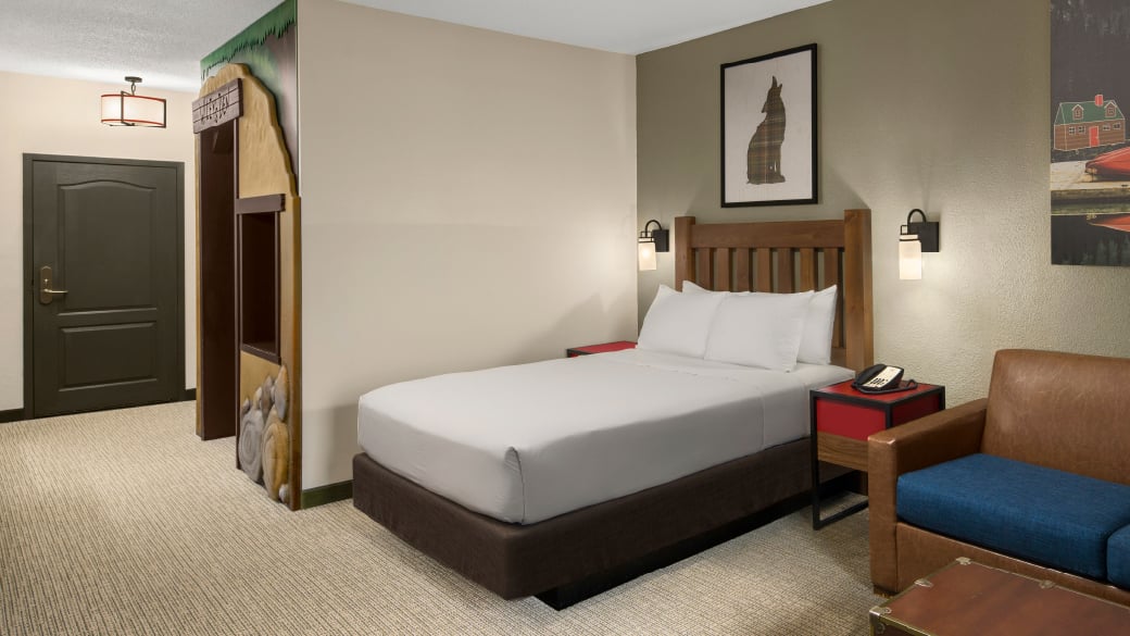 Kids and parents alike love staying in the Wolf Den Suite. The suite includes built-in wolf’s den-themed sleeping quarters. This Northwoods-themed sleeping area is furnished with bunk beds. The main living area features a queen bed and a full-size sleeper sofa.