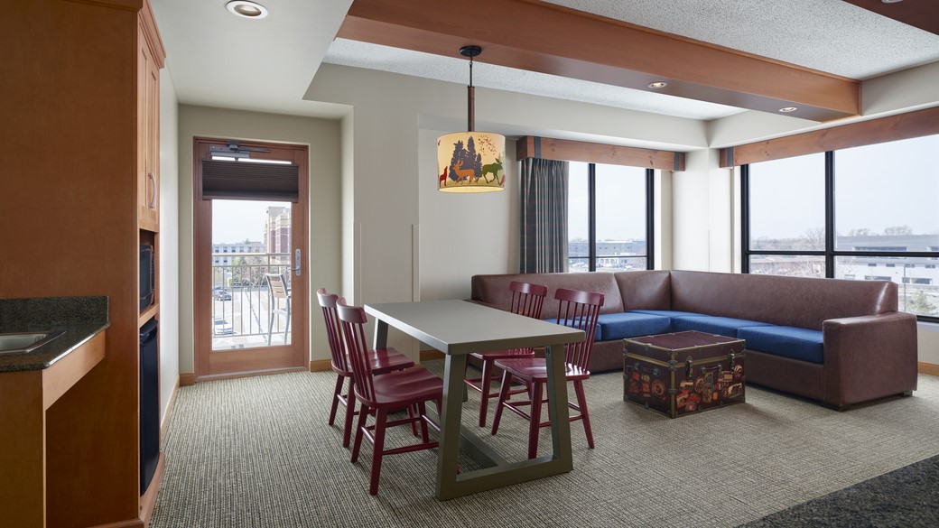 The Deluxe Majestic Bunk Bed Suite features a king bed and second bathroom in a private bedroom for mom and dad. In the main living area, a full-size sofa sleeper and one set of bunk beds for your pups to slumber in after a day at the water park, and dining area to gather around.